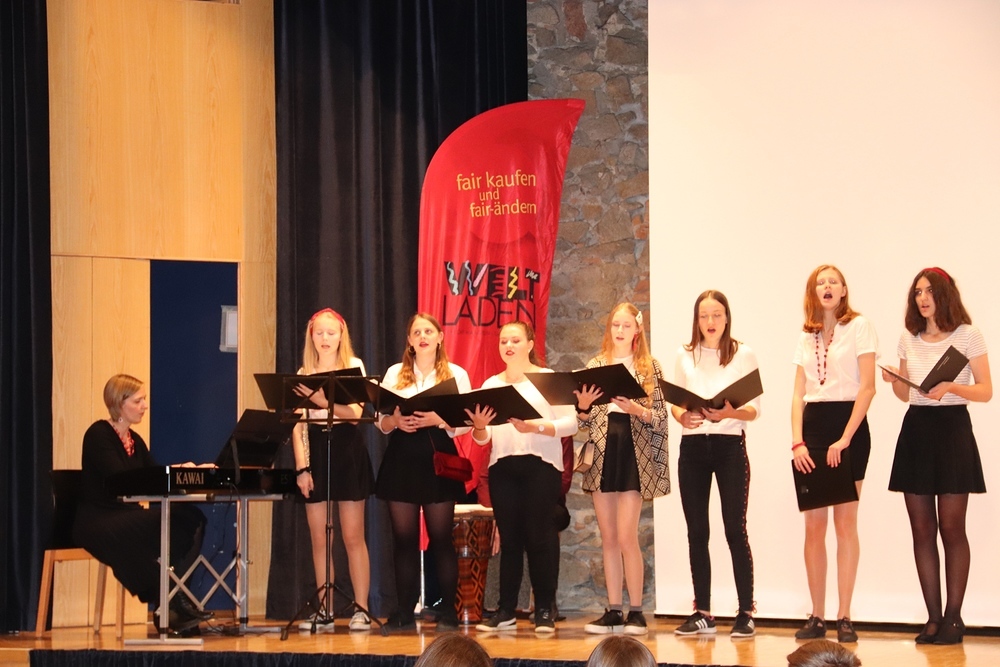 SchülerInnen und Eltern der Neuen Mittelschule Schärding boten in der Pause Kostproben aus ihrem internationalen Kochbuch an. Köstlichkeiten aus Fairem Handel gab es vom Weltladen Schärding.